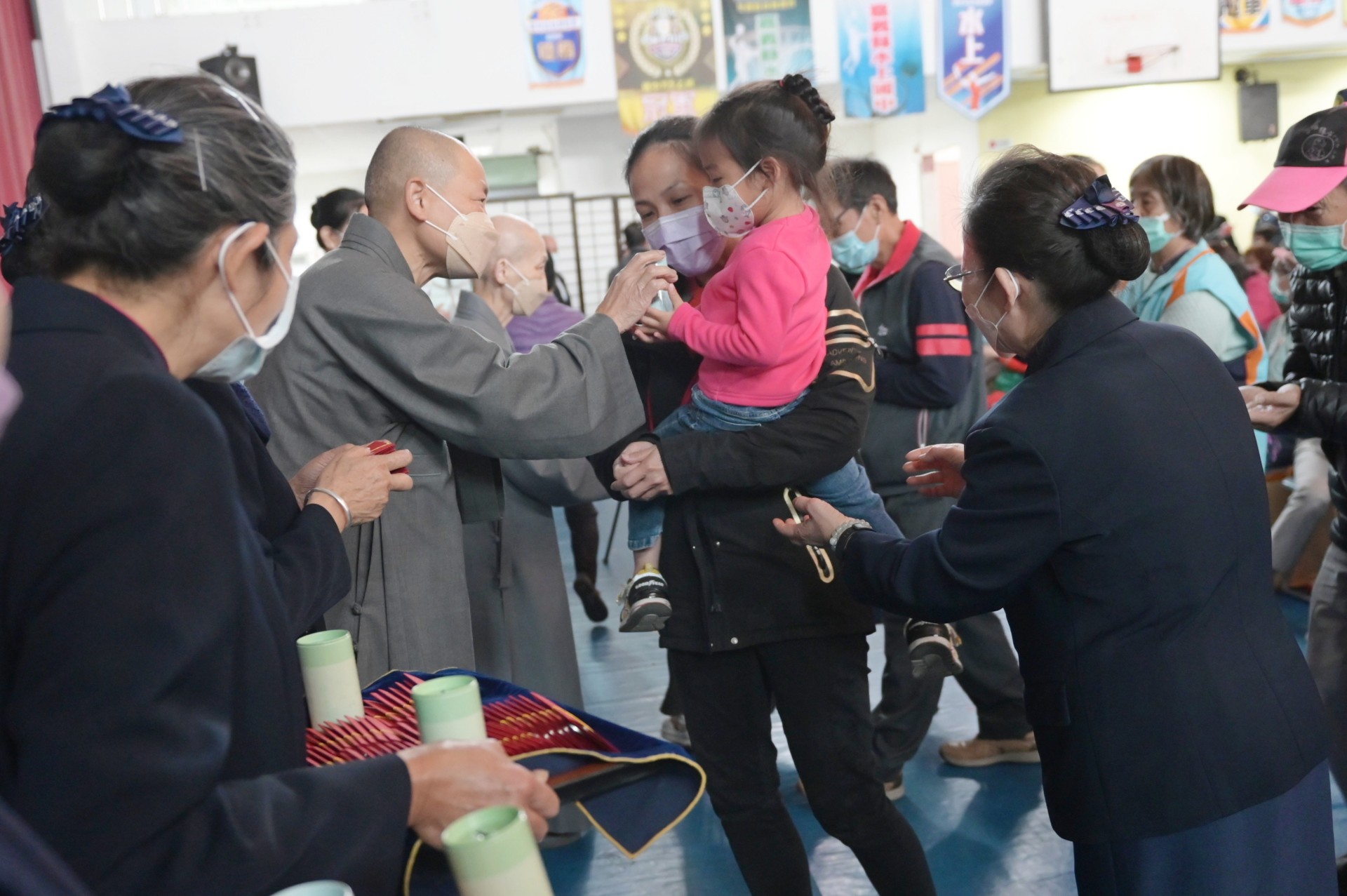大家引領期待的時刻來臨,精舍師父帶來上人的福慧紅包,鄉親們雙手合十虔誠地依序上台領紅包。