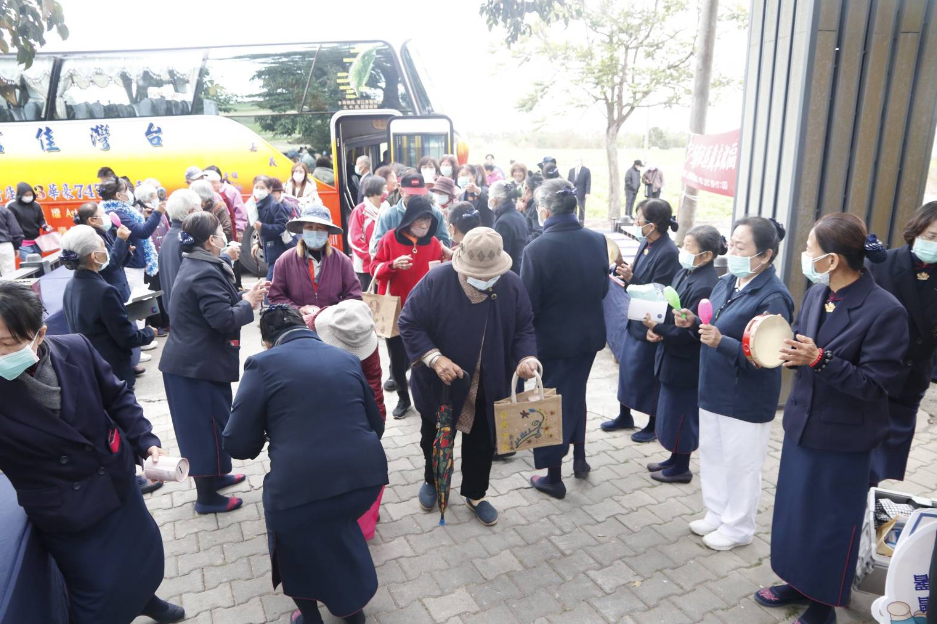約略八點時分遠遠地見到田間小路忽然有大型的遊覽車,緩緩地來到慈濟太保共修處,來自嘉義縣太保市、六腳鄉地區的鄉親分別乘坐六輛遊覽車,邀約一起來參加「2025年慈濟嘉義區太保共修處歲末祝福感恩會」,鄉親們扶老攜幼地來參與。