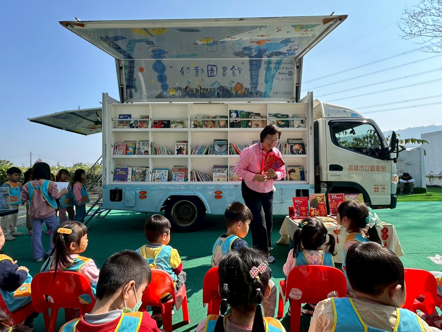 為迎接新春佳節並拓展幼兒國際文化視野,高雄市立圖書館阿蓮分館走進社區幼兒園,辦理「國內外新年繪本說故事活動」,並結合行動書車到園服務,將豐富多元的館藏資源直接帶到孩子身邊。透過借閱體驗與生動有趣的故事分享,帶領孩子認識不同國家的過年習俗,在溫馨歡樂的氛圍中體驗多元文化之美。
