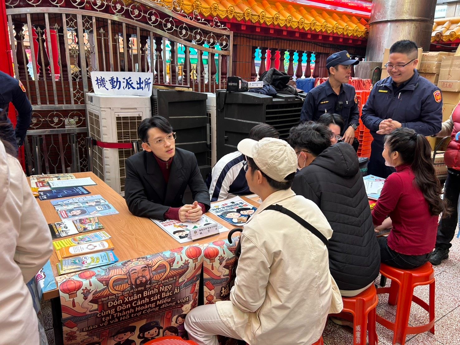 博愛路派出所轄內寺廟古蹟林立,春節期間走春人潮絡繹不絕。為落實「看得到警察、找得到協助」的服務理念,中正第一分局特別設置機動派出所,提供受理報案、交通路況諮詢及防詐宣導等服務。此次更安排精通越南語的員警現場協助,為新住民朋友提供法律諮詢與即時翻譯服務,展現警政服務的溫度與包容。