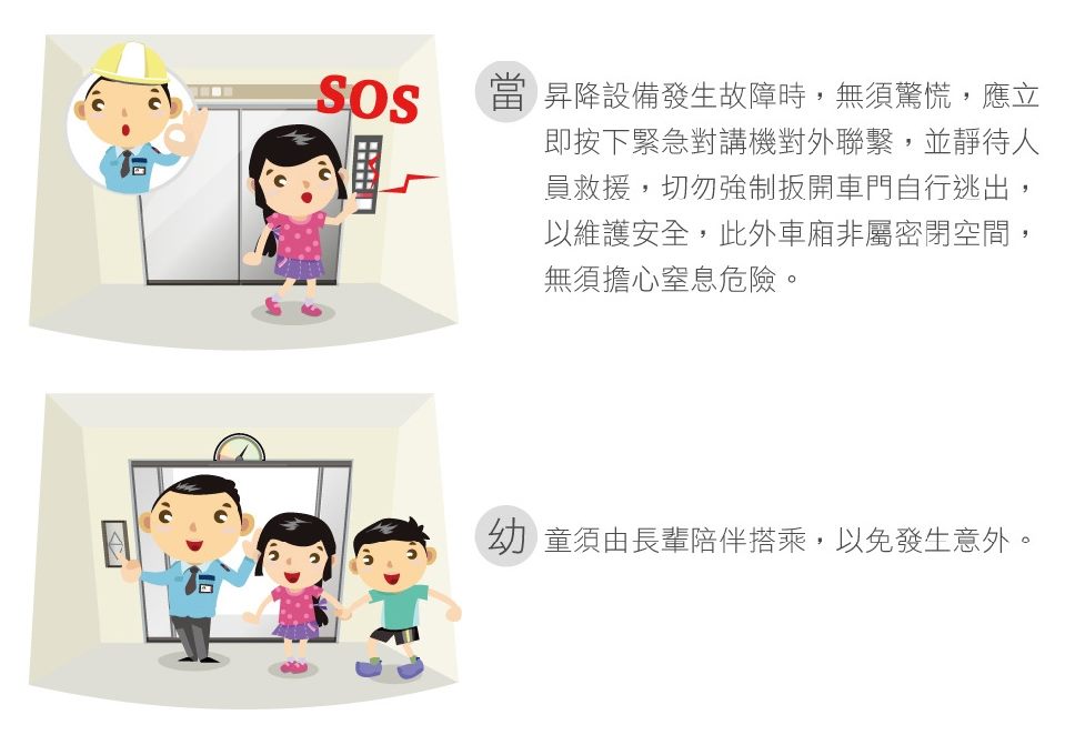 電梯是一個現代人生活上不可缺少的乘載運輸工具,也因為頻繁的使用因素,難免會有故障時刻。臺北市建築管理工程處處長虞積學呼籲受困電梯民眾首先應保持冷靜切勿驚慌,並利用電梯操作盤的緊急按鈕或個人通訊設備求救,一般情形優先通知大樓值班或公共場所管理人員,並由場所值班管理人員連繫電梯保養廠商趕來救援,或使用個人手機通訊設備,依機廂內電梯保養廠商聯絡資訊直接通報。