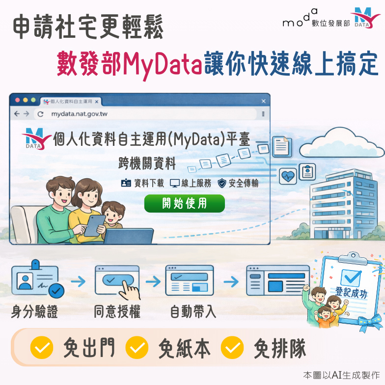 數發部指出,民眾透過MyData平臺可快速取得戶籍、財產、所得等相關資料,免除親赴機關申請及準備紙本文件的繁瑣程序;申請社宅所需家庭成員相關資料,也可透過MyData平臺由家庭成員本人完成身分驗證後快速取得。透過MyData平臺,不僅提升資料正確性,還能有效縮短整體申辦時間。