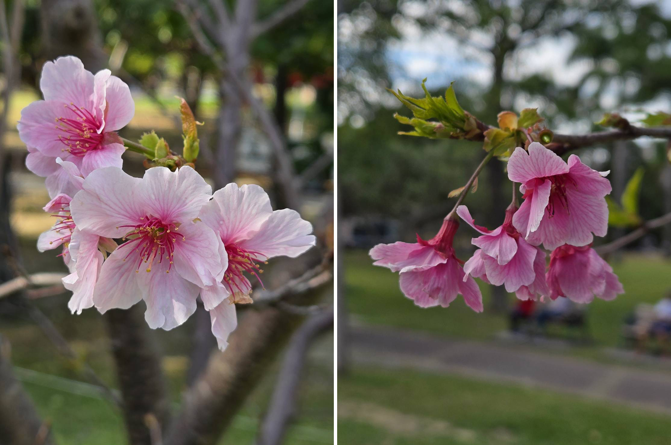 公園處藍舒凢處長表示,率先綻放的是7號公廁棕櫚區旁的「河津櫻」,河津櫻源自日本靜岡縣河津町,特色為花期長,單朵花色鮮豔濃粉、花瓣厚實,盛開時整株如粉紅雲霞般醒目亮麗。目前即使部分枝條已悄悄抽出嫩葉,仍不減其繁花滿枝的熱情姿態。河津櫻已進入滿開,建議民眾儘早把握時間,捕捉河津櫻最燦爛的身影。