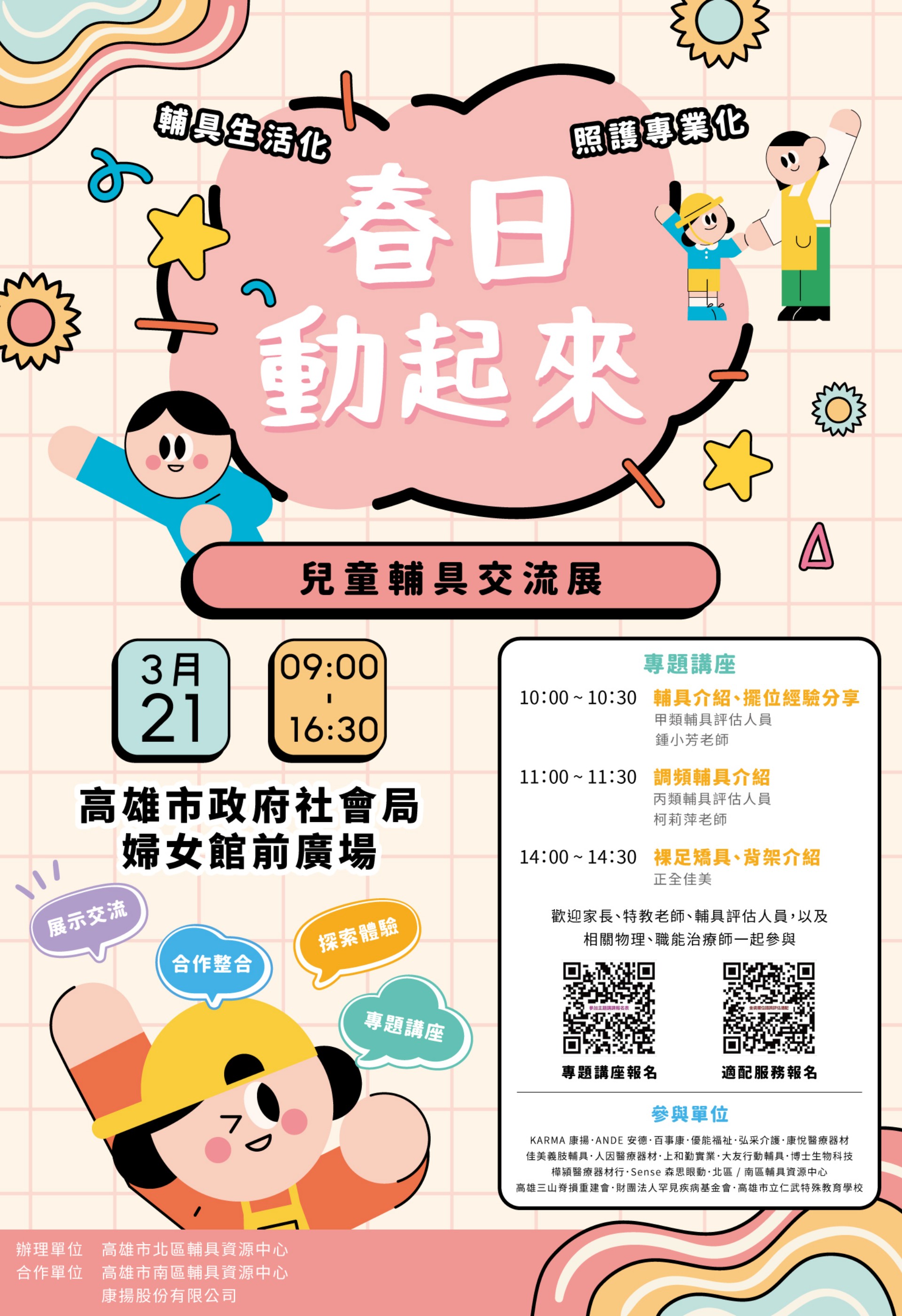 本次活動由高雄市政府社會局指導,高雄市北區輔具資源中心主辦,並由高雄市政府社會局兒童福利服務中心、高雄市政府社會局婦女館、高雄市南區輔具資源中心及康揚股份有限公司協辦。活動結合多家兒童輔具廠商與相關單位,打造交流平台,期望推動「輔具生活化、照護專業化」,讓更多家庭與專業人員掌握最新輔具資訊與應用方式。
