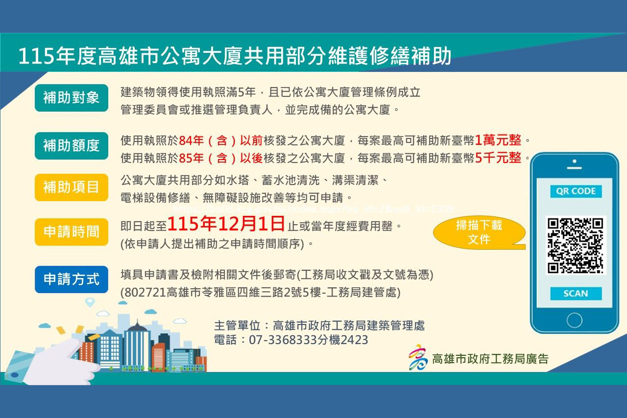為協助社區持續維護老舊公共設施使用安全、提升整體居住品質,高雄市政府工務局今(23)日指出,115年度「公寓大廈共用部分維護修繕費用補助」,即日起受理申請,期限至115年12月1日止,或經費用罄為止。