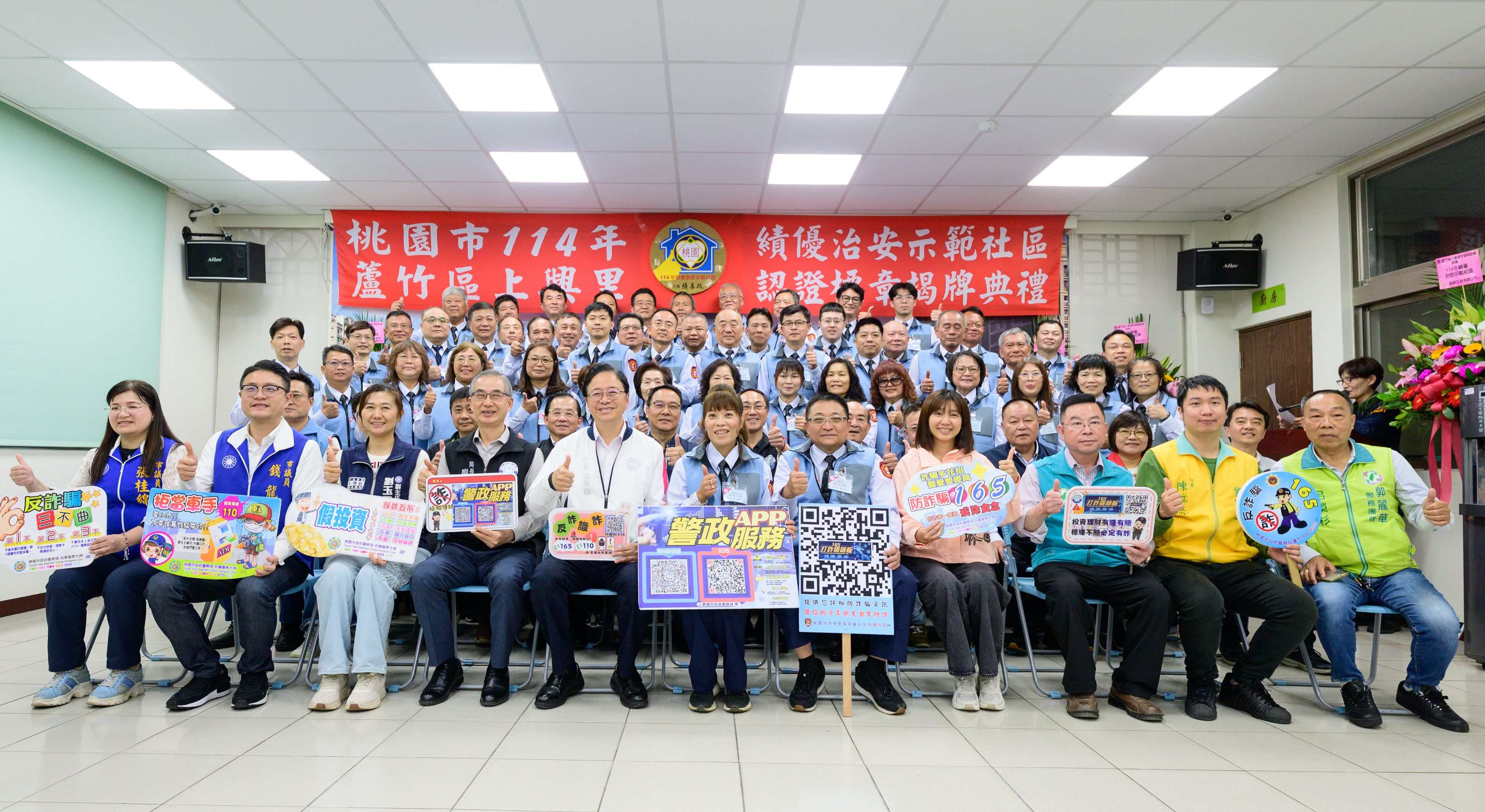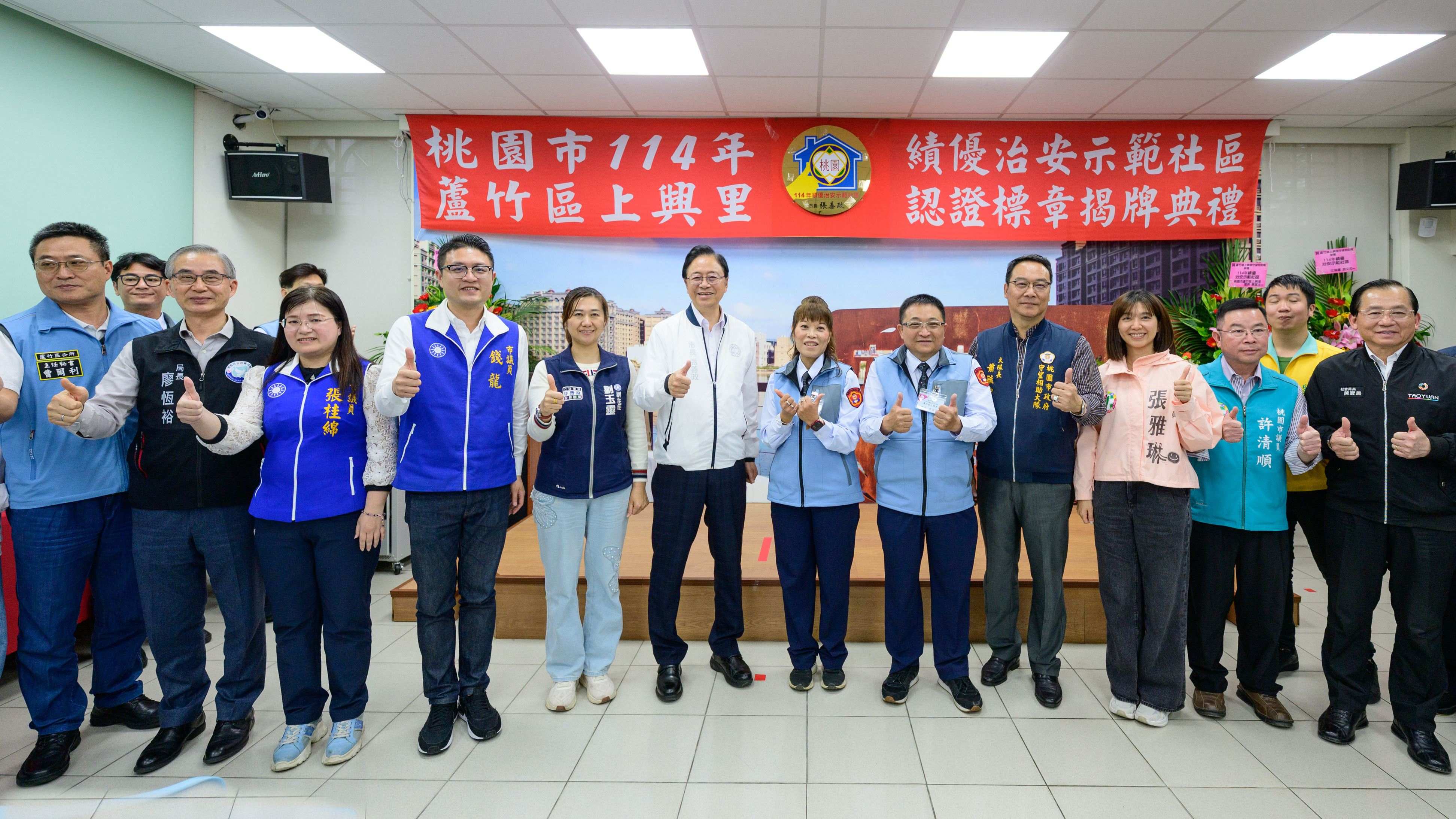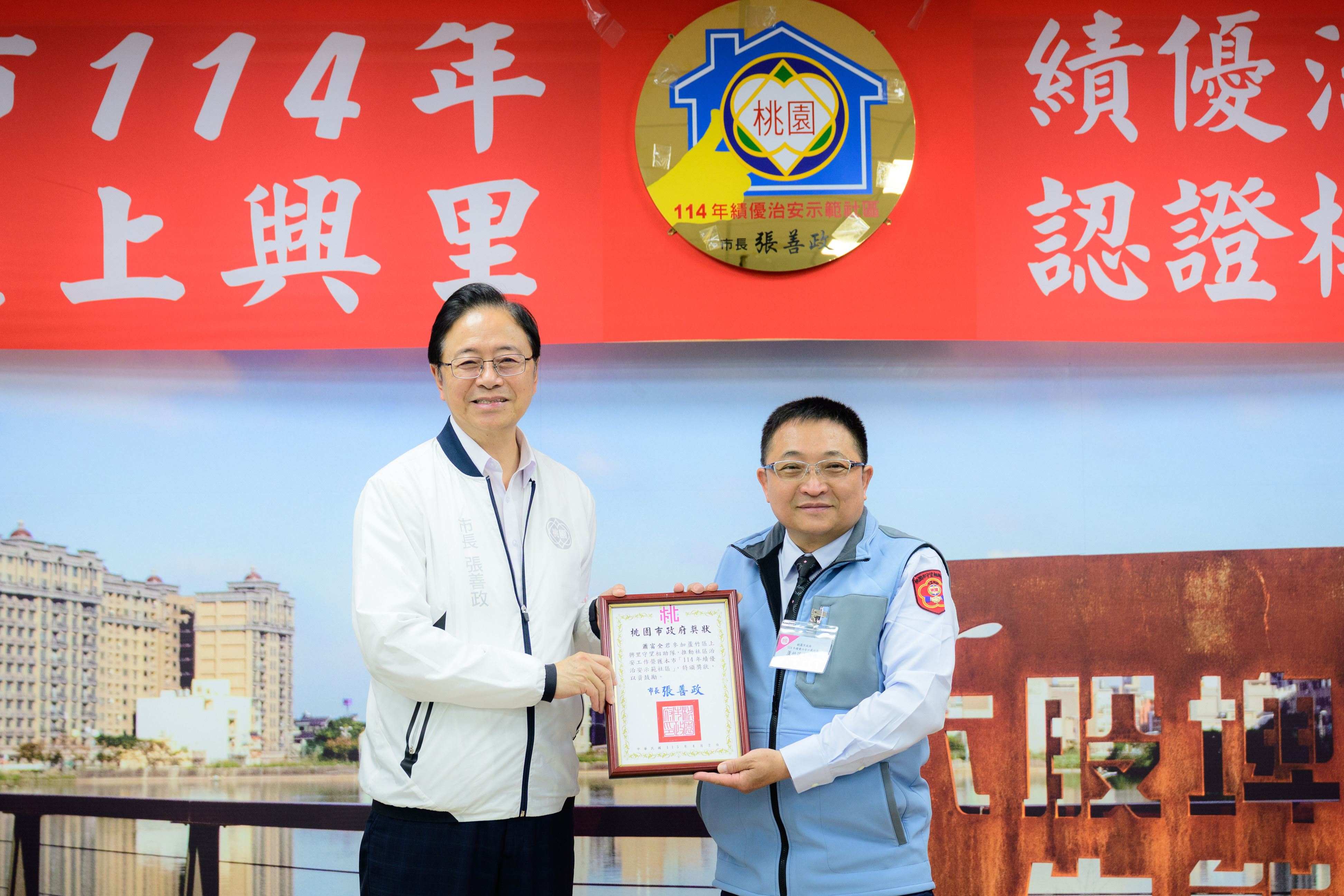 警察局表示,市府每年辦理「桃園市績優治安示範社區認證標章」評核,內容涵蓋警政、社政及消防三大面向,定期檢視社區安全成效。114年獲選社區除頒發認證標章外,並核發工作經費新臺幣6萬元,本次由蘆竹區上興里獲此殊榮,肯定其在治安維護上的卓越表現。