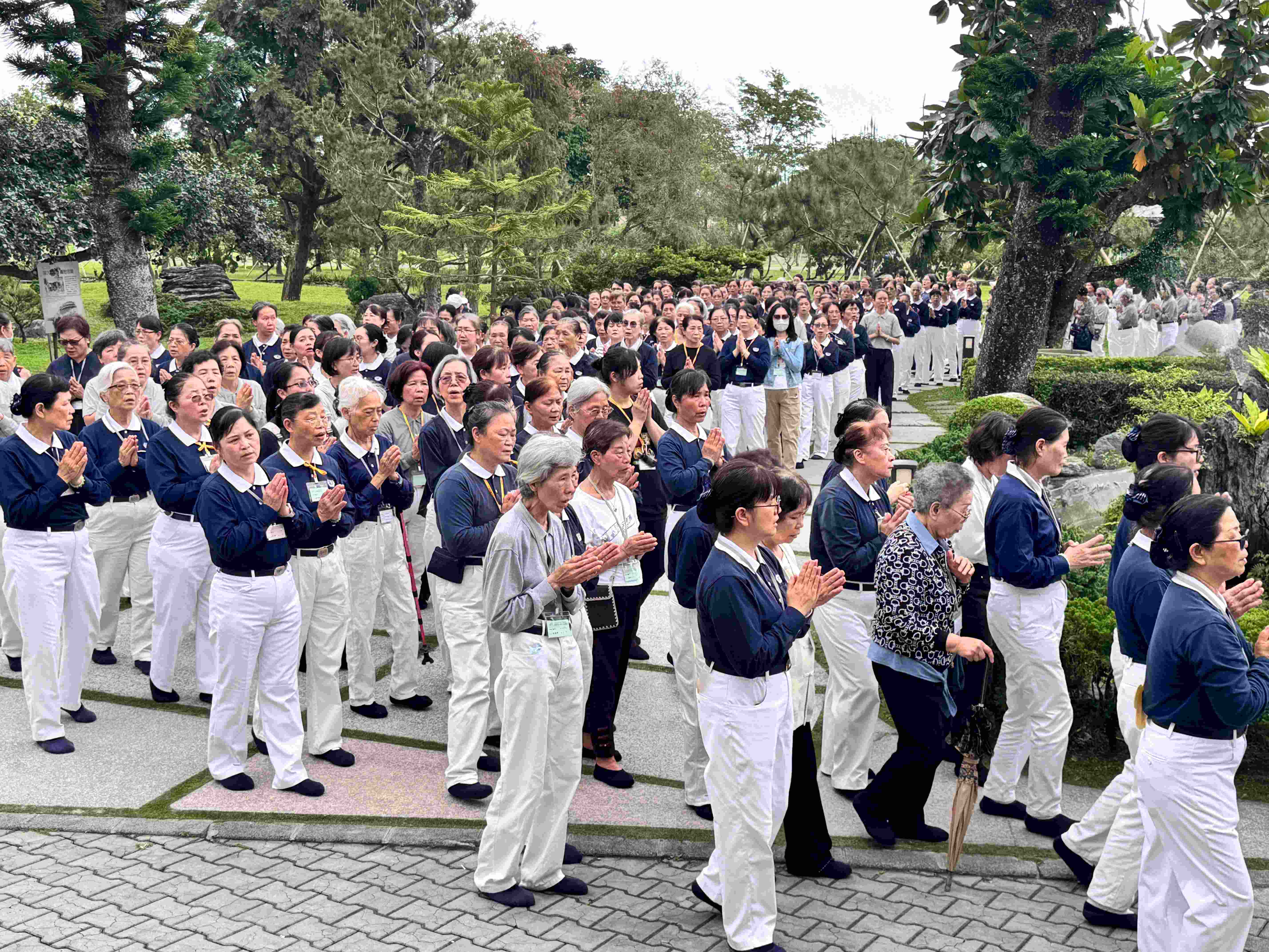 隊伍中除了步伐穩健的志工,也有需仰賴輔具前行者。台中慈濟志工吳貞葉坐在輪椅上,由女兒推著、隨佛號前進。母女倆清晨4點起床與隊伍會合,只為回到心靈故鄉。吳貞葉表示,行進中一心念佛,法喜充滿;適逢60周年,能與女兒同行格外珍貴。儘管途中遇到草地推行不易,但是關關難過、關關過,感恩有孝順的女兒同行,讓她滿懷感恩,也感受到親情與信念的力量。