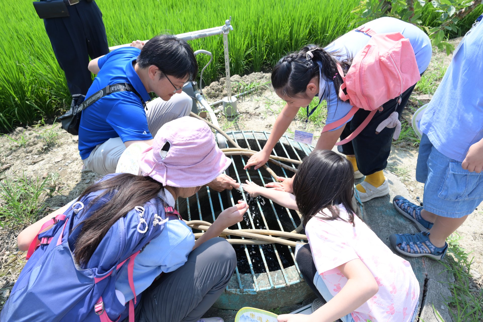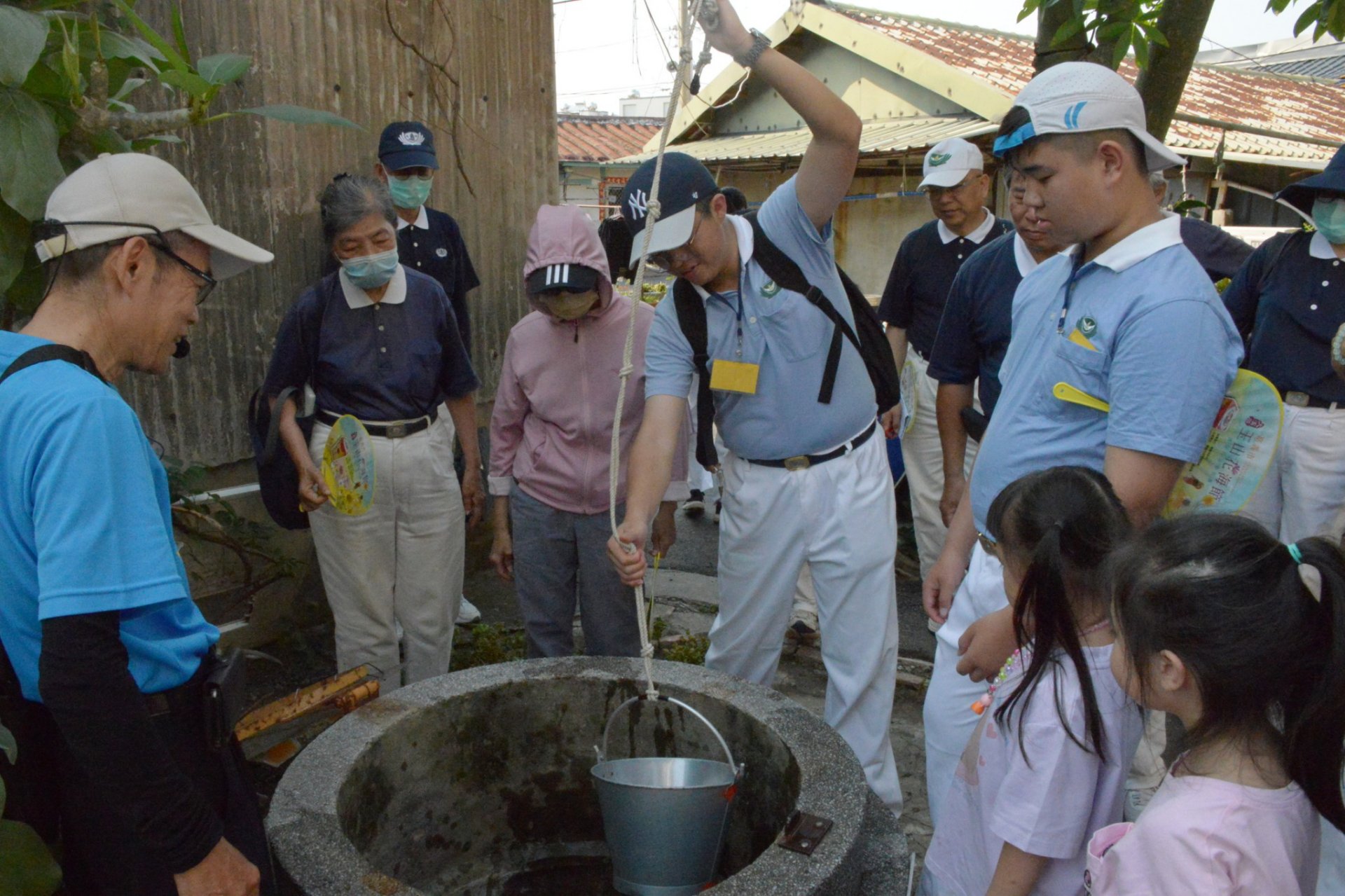 在嘉義市大溪社區發展協會的導覽下,學員們認識大溪厝擁有八口超過百年歷史的古井,井水清澈且源源不絕,至今仍有部分持續使用。儘管天氣炎熱,學員們依然專注聆聽,並踴躍體驗汲水與澆灌植物的過程,在實作中感受先民取水的不易。