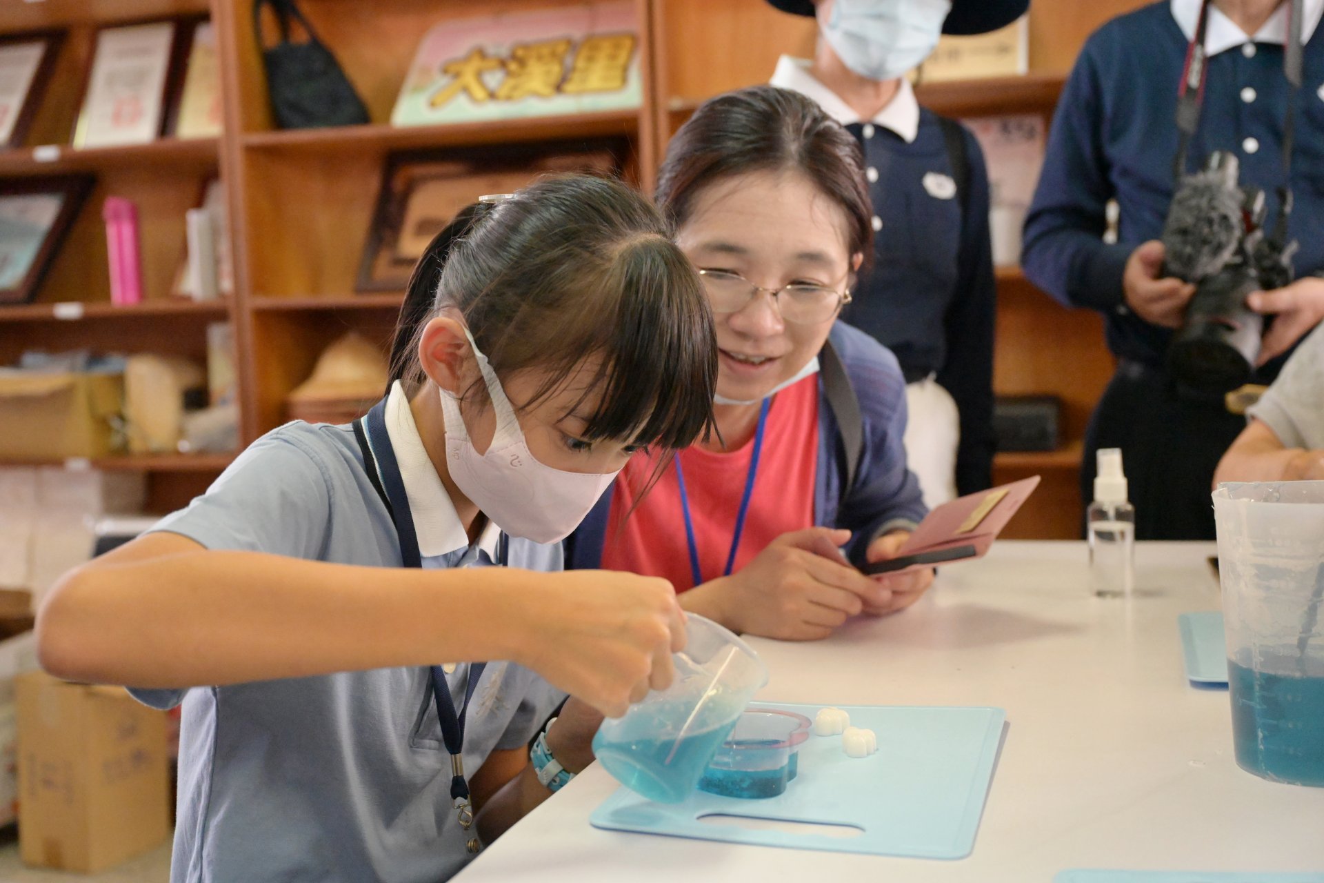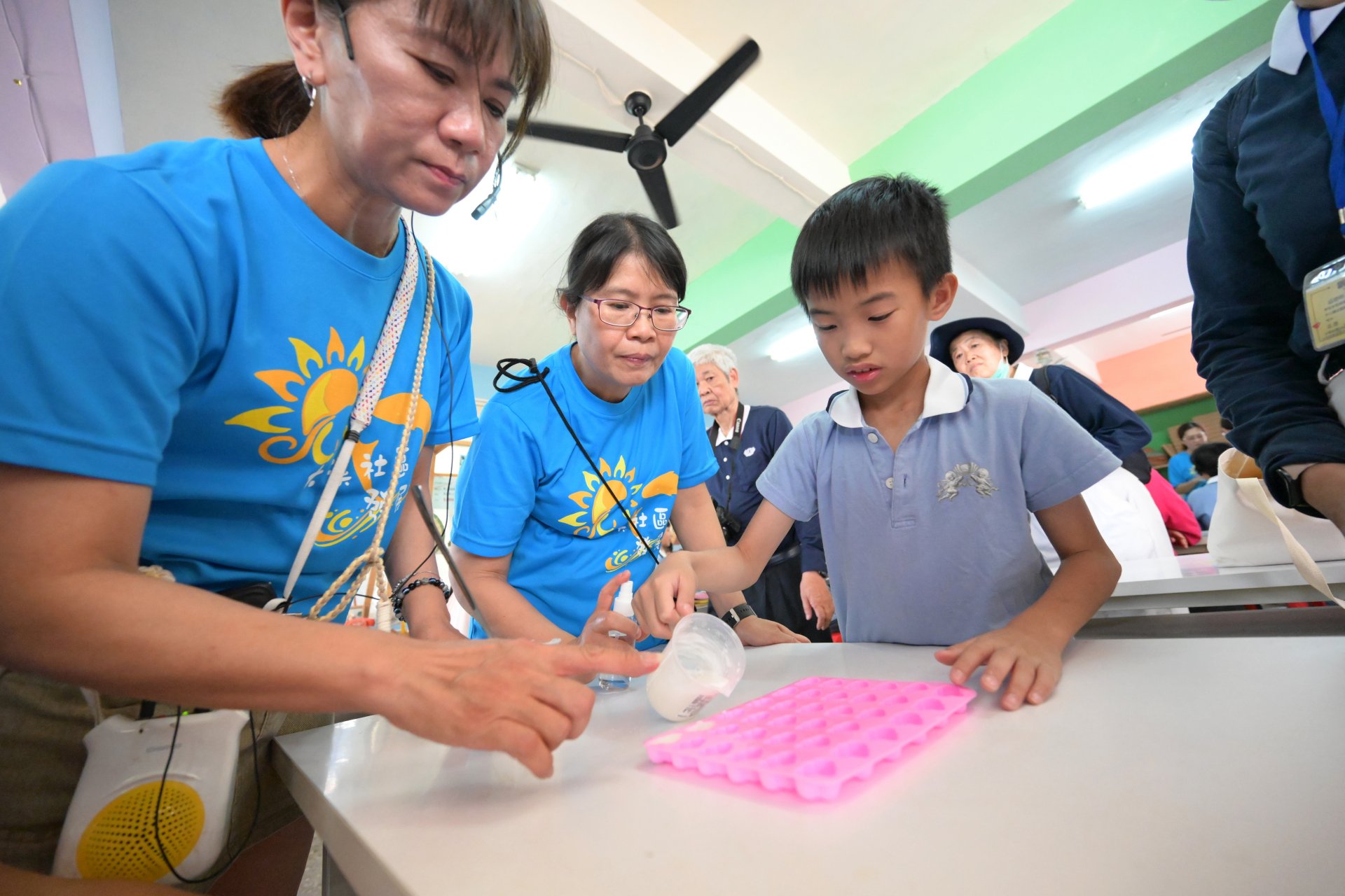 「大溪里社區發展協會」鄭靜瑛志工,教親子班學員做雲朵手工皂,並以紅、黃、藍三原色調皂色,甚至加入些許薰衣草或是檸檬香味精油。白色的雲朵嵌入藍色、紫色或綠色的皂液中,顯得小巧與特別有創意,鄭志工更不忘時時提醒小朋友要對皂液噴酒精,去除它的泡泡,與分二階段填滿模型。半個鐘頭左右,家長與小朋友即攜手完成,個人喜愛的一顆漂亮的手工皂。